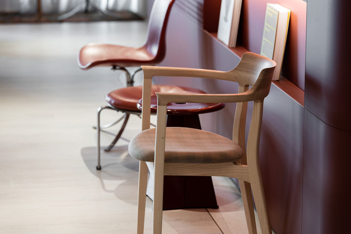 Fly Hirundo features softly flowing lines, as if gently blown by a breeze. It follows the same S-shaped leg design as Hirundo chair, with a backrest that gently embraces the body.